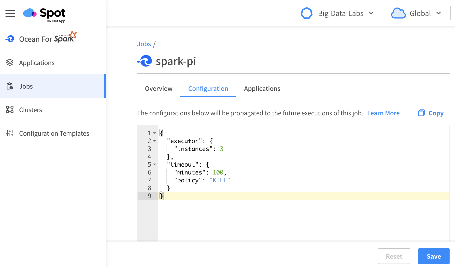 To edit the configuration for a job from the Spot console, go to Ocean Spark in the menu tree, click on Jobs, find the Job that you're interested in, and then click on the Configuration Tab.
