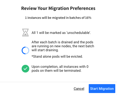 Once you have started the migration, you will have the option to stop it. However, workloads that have been migrated to Spot remain under the new instances that are managed by Spot. This means that when stopping the process, Spot finishes scheduling all unscheduled pods of the current batch, and instances that were not drained yet become schedulable again.