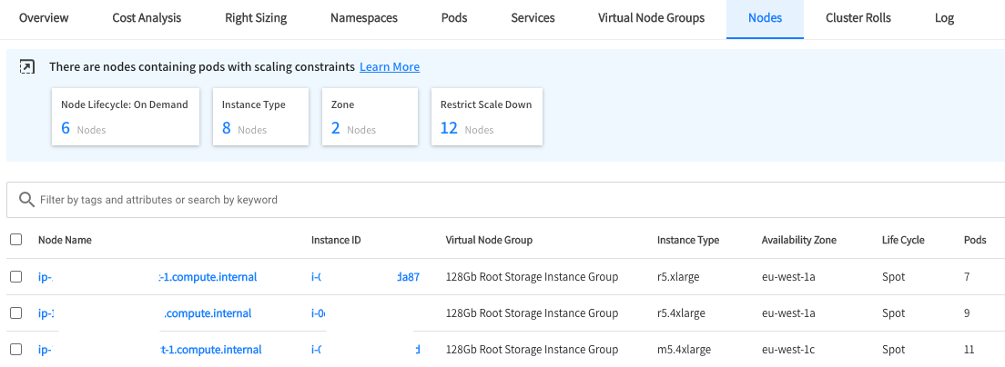 In an Ocean cluster, you can also see information in the Pods tab about scaling constraints applied.