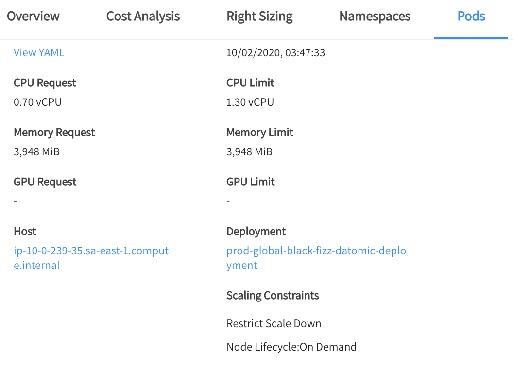 For a drill-down of more detail about the constraints on a specific pod, click on the Pod Name. In the pod details, you will see a list of scaling restrictions applied to that pod.